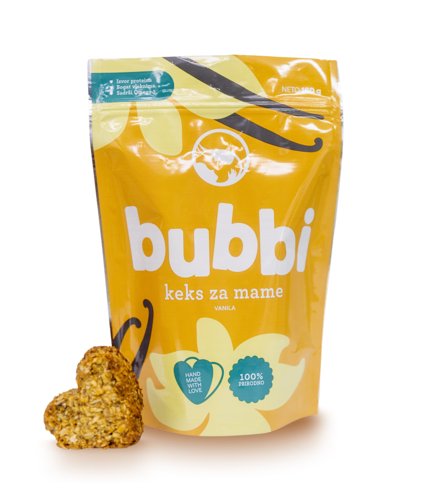 Bubbi keks sa ukusom vanile predstavlja laganu i aromatičnu užinu za mame. Spoj ovsa, vanile, suncokretovog lecitina koji se tradicionalno preporučuje mamama u ovom periodu i ostalih pažljivo odabranih sastojaka daje im neodoljiv ukus. Svaki keks u obliku srca osmišljen je da unese sitno zadovoljstvo u vašu svakodnevicu.
